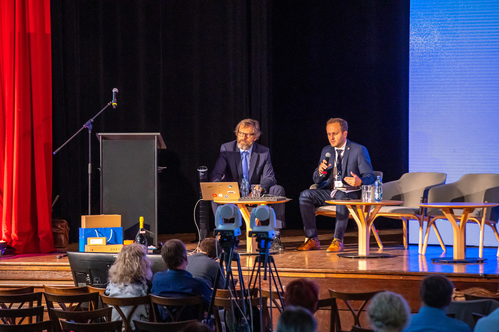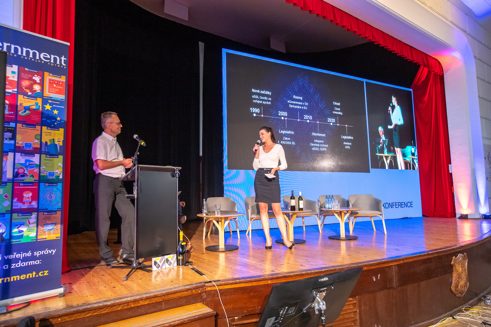 11:00 KULATÝ STŮL - ŽIVÉ "VYSÍLÁNÍ" STUDIA EGOVERNMENT Součástí dopoledního bloku bude speciální konferenční "vysílání" studia Egovernment přímo z pódia zámeckého sálu. Do diskuze, kterou zde povedeme, budou moci vstoupit svými dotazy diváci v sále i doma u počítače . Studio bude rozděleno na několik tématických částí.